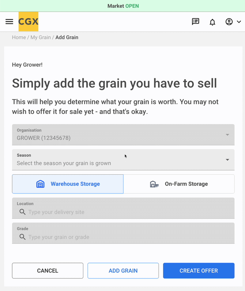 Then simply select the specific grain, grades and storage relevant to your grain and press "add grain".