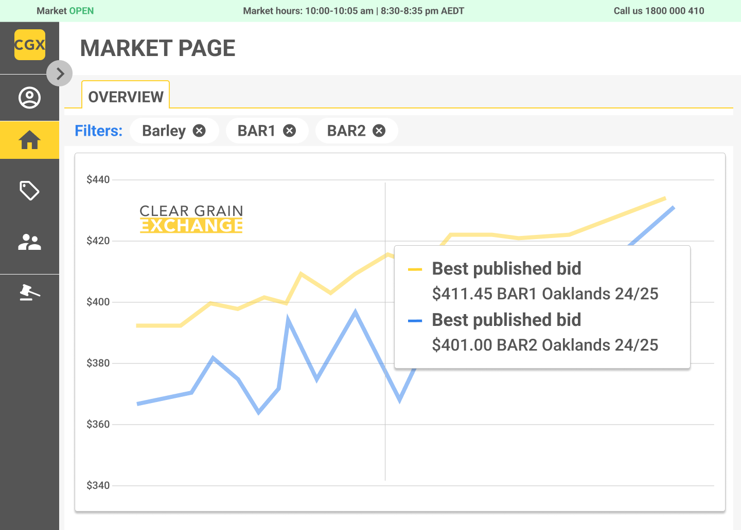 The 'VIEW MARKET' button in each grain card will take you to the 'OVERVIEW' tab where you can see price history.
