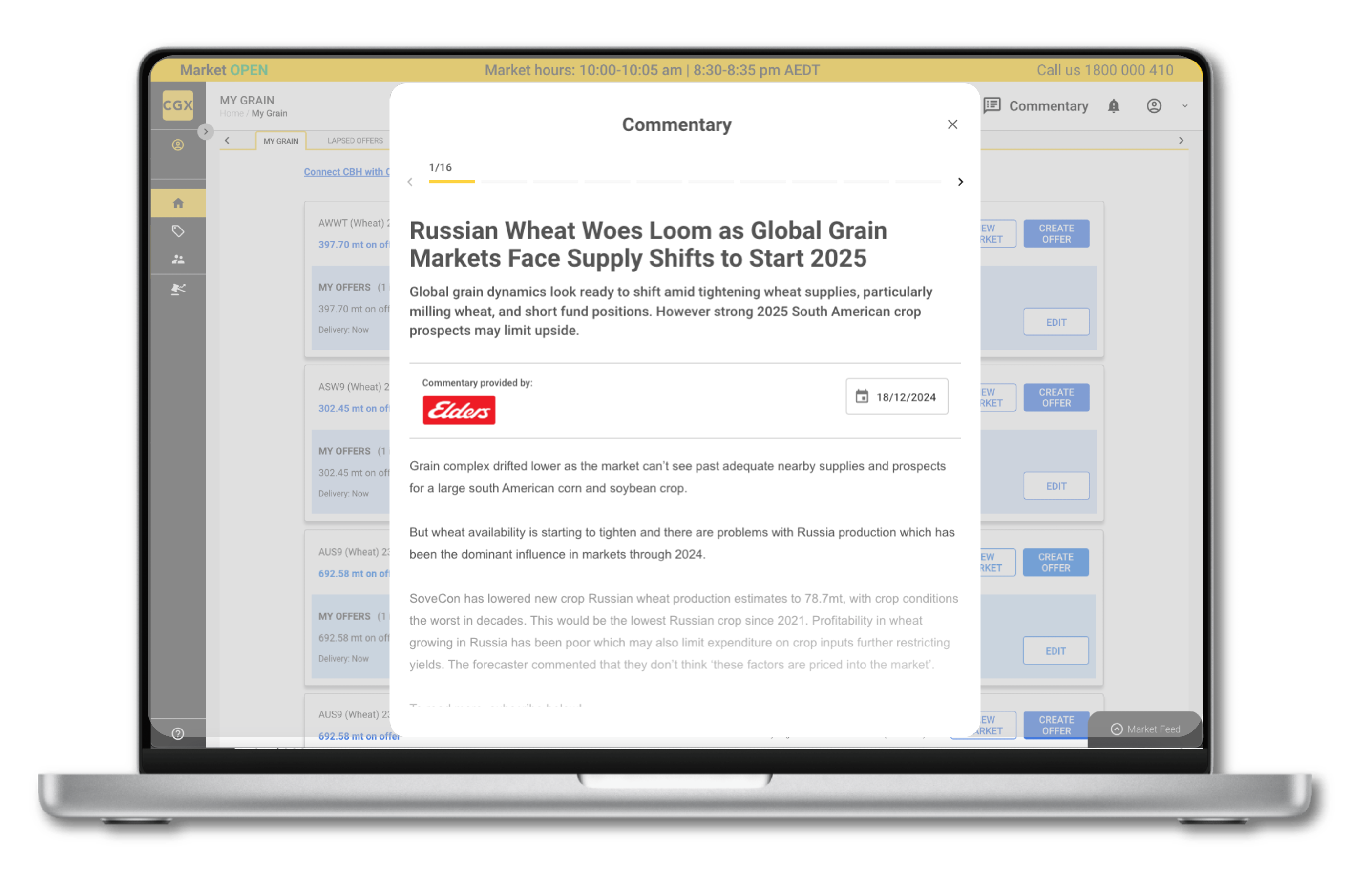 Richard Koch, grain market analyst at Elders, provides daily market commentary available exclusively through CGX. There's a sample of his wisdom below.