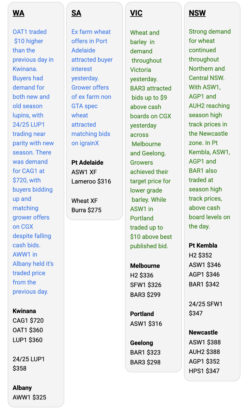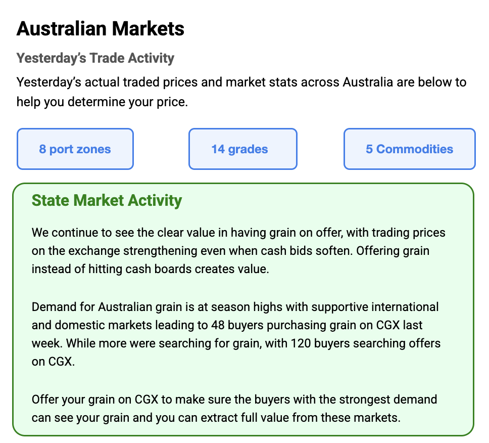 Australia’s independent grain report—designed to help support your pricing decisions before the market opens at 10:00am AEST. If you need to change your offer price, simply edit it before market open.