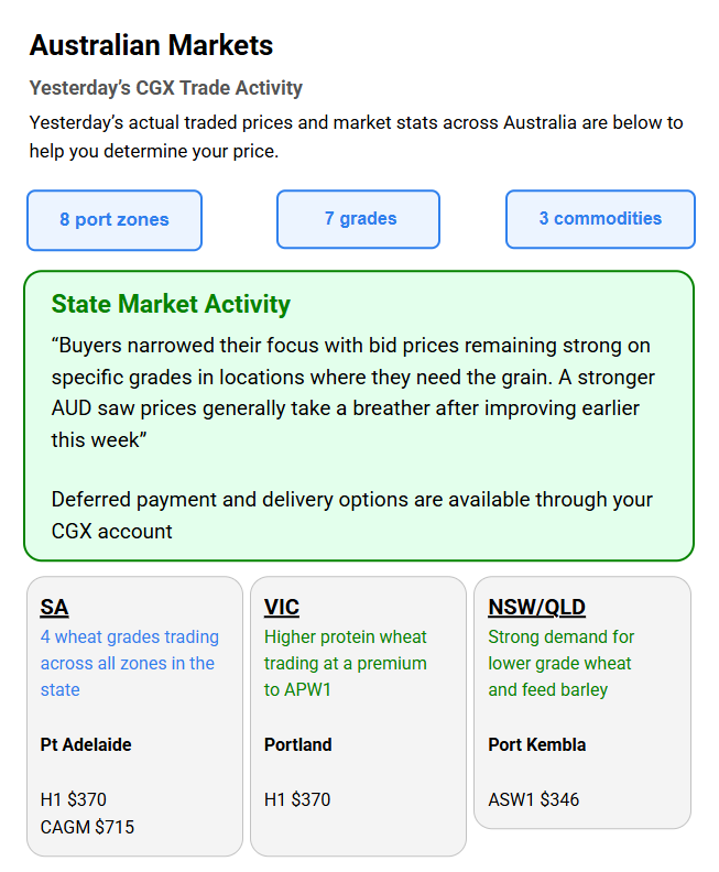 Australia’s independent grain report—designed to help support your pricing decisions before the market opens at 10:00am AEST. If you need to change your offer price, simply edit it before market open.