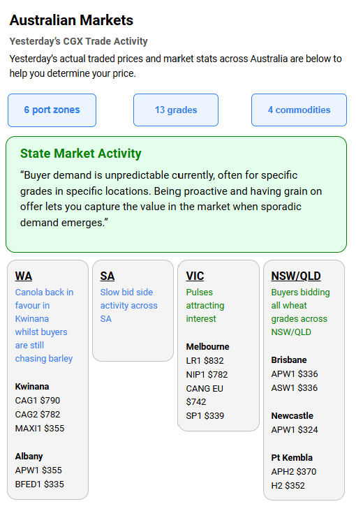 Australia’s independent grain report—designed to help support your pricing decisions before the market opens at 10:00am AEST. If you need to change your offer price, simply edit it before market open.