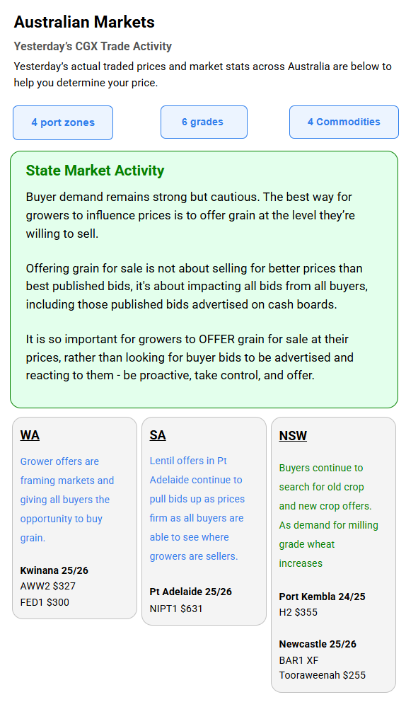 Australia’s independent grain report—designed to help support your pricing decisions before the market opens at 10:00am AEST. If you need to change your offer price, simply edit it before market open.