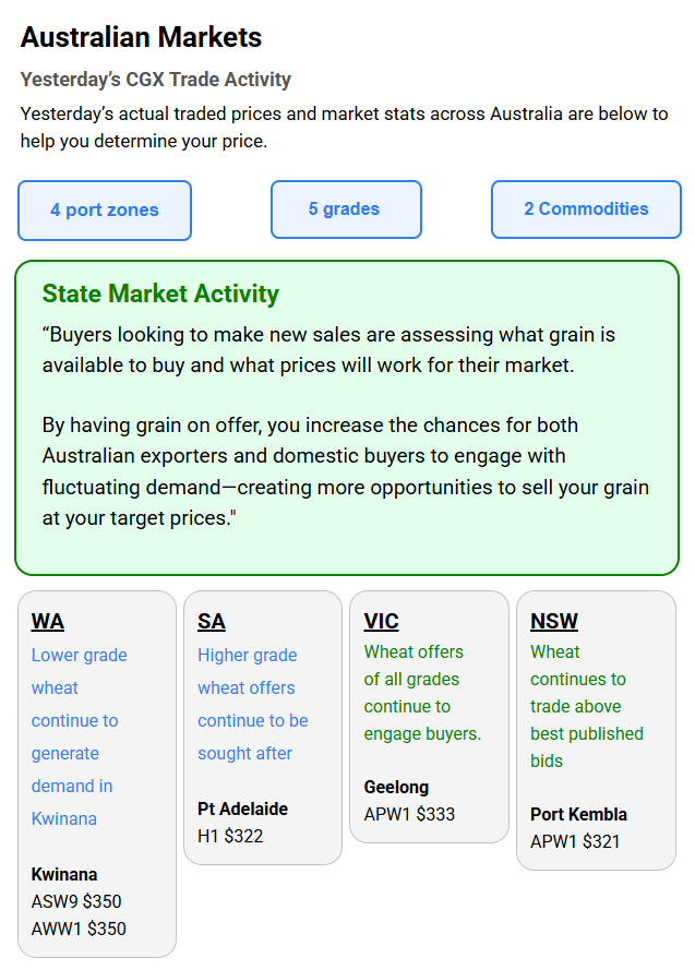 Australia’s independent grain report—designed to help support your pricing decisions before the market opens at 10:00am AEST. If you need to change your offer price, simply edit it before market open.