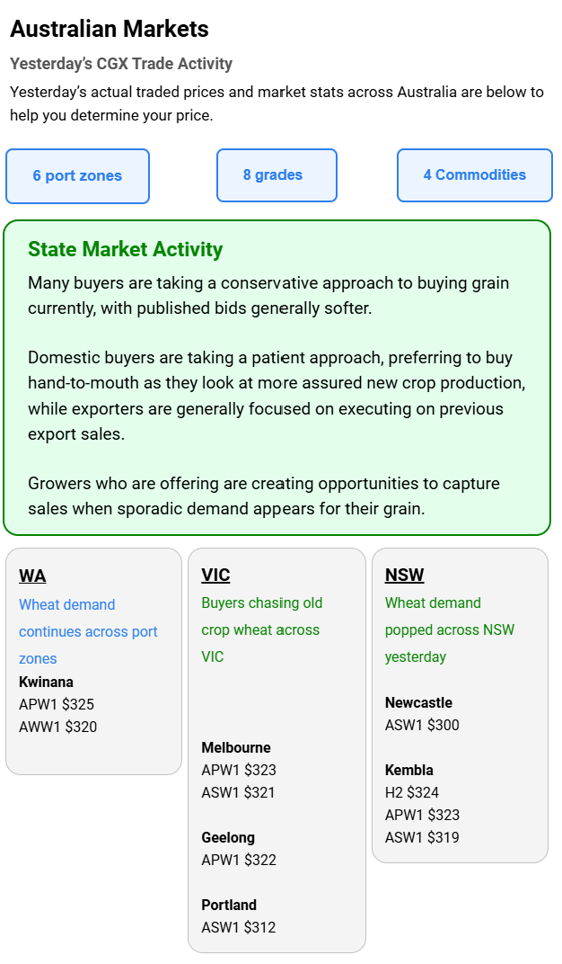 Australia’s independent grain report—designed to help support your pricing decisions before the market opens at 10:00am AEST. If you need to change your offer price, simply edit it before market open.