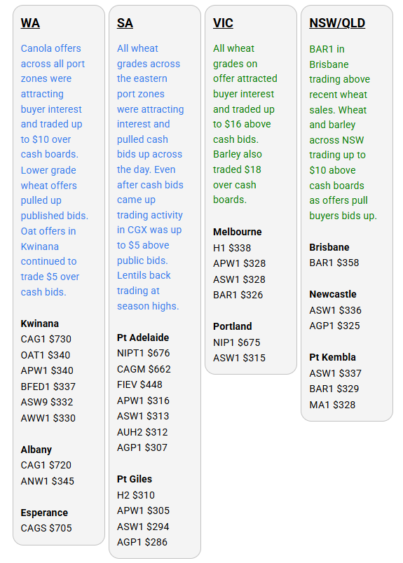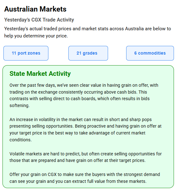 Australia’s independent grain report—designed to help support your pricing decisions before the market opens at 10:00am AEST. If you need to change your offer price, simply edit it before market open.