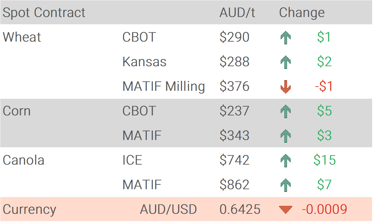 Local grain values were easier in northern feeding zones but firm across the south. Reports of the odd spot load trading at a premium due to weather in some areas. Growers are yet to hit the button on grain sales which has supported values. Low liquidity is making it difficult to get a real read on market direction.