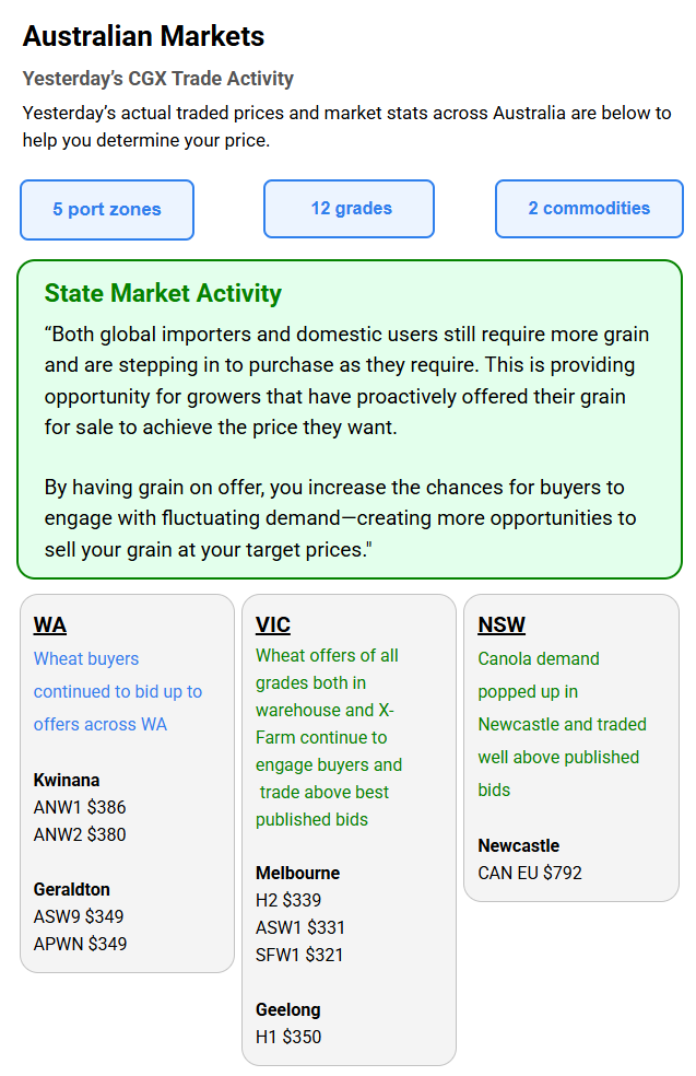 Australia’s independent grain report—designed to help support your pricing decisions before the market opens at 10:00am AEST. If you need to change your offer price, simply edit it before market open.