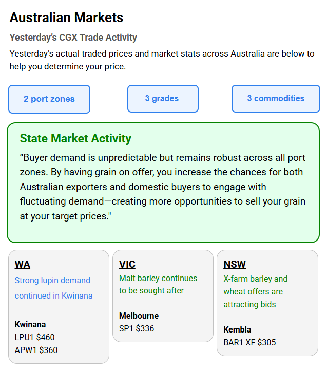 Australia’s independent grain report—designed to help support your pricing decisions before the market opens at 10:00am AEST. If you need to change your offer price, simply edit it before market open.