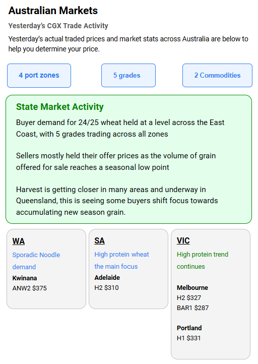 Australia’s independent grain report—designed to help support your pricing decisions before the market opens at 10:00am AEST. If you need to change your offer price, simply edit it before market open.