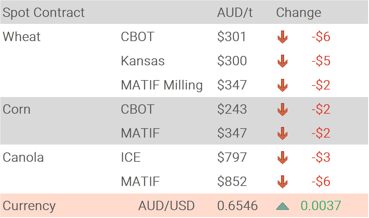 Not much to hang our hats on overnight with selling pressure on wheat about to ramp up on two fronts – internationally as the northern hemisphere harvest gets into full swing and locally as we enter the new financial year and as farmers Dubbo north prepare to let some stocks go in preparation for the coming harvest which looks all but assured in northern cropping zones.