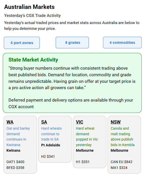 Australia’s independent grain report—designed to help support your pricing decisions before the market opens at 10:00am AEST. If you need to change your offer price, simply edit it before market open.