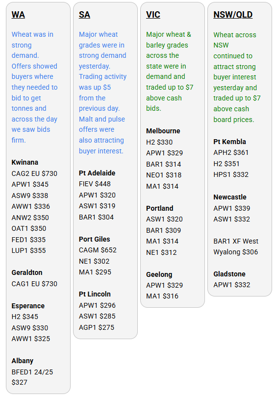 Australia’s independent grain report—designed to help support your pricing decisions before the market opens at 10:00am AEST. If you need to change your offer price, simply edit it before market open.