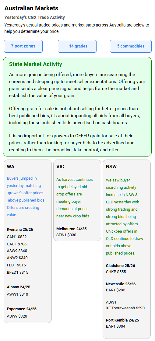 Australia’s independent grain report—designed to help support your pricing decisions before the market opens at 10:00am AEST. If you need to change your offer price, simply edit it before market open.