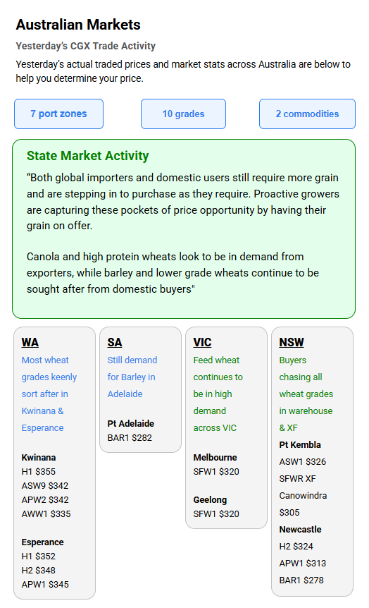 Australia’s independent grain report—designed to help support your pricing decisions before the market opens at 10:00am AEST. If you need to change your offer price, simply edit it before market open.