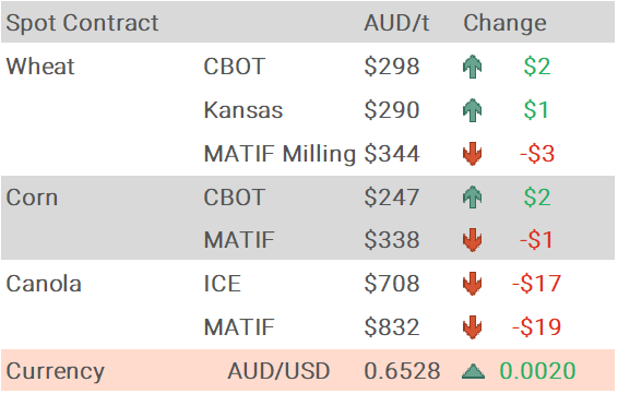Domestic delivered bids are steady to $7/t lower with most pricing pressure evident in the north on barley. Old crop barley delivered Downs is down $7/t to $308/t and new crop $10/t lower at $305/t. Wheat is $1/t lower on old crop at $326/t and $4/t lower on new crop at $326/t with old and new crop markets converging with the start of harvest 4 weeks away.