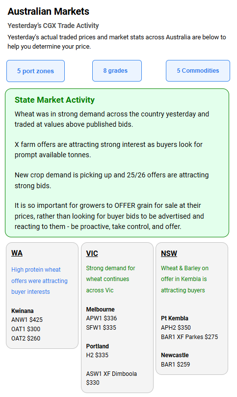 Australia’s independent grain report—designed to help support your pricing decisions before the market opens at 10:00am AEST. If you need to change your offer price, simply edit it before market open.