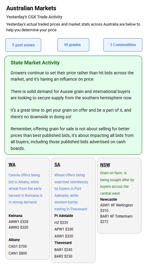 Australia’s independent grain report—designed to help support your pricing decisions before the market opens at 10:00am AEST. If you need to change your offer price, simply edit it before market open.