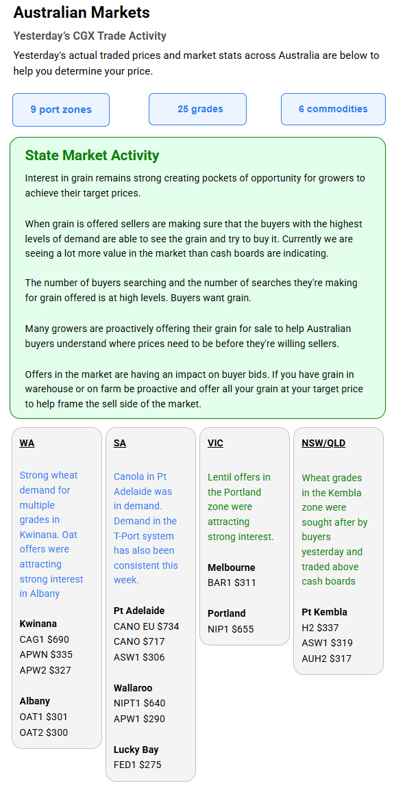 Australia’s independent grain report—designed to help support your pricing decisions before the market opens at 10:00am AEST. If you need to change your offer price, simply edit it before market open.