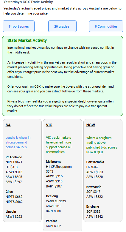 Australia’s independent grain report—designed to help support your pricing decisions before the market opens at 10:00am AEST. If you need to change your offer price, simply edit it before market open.