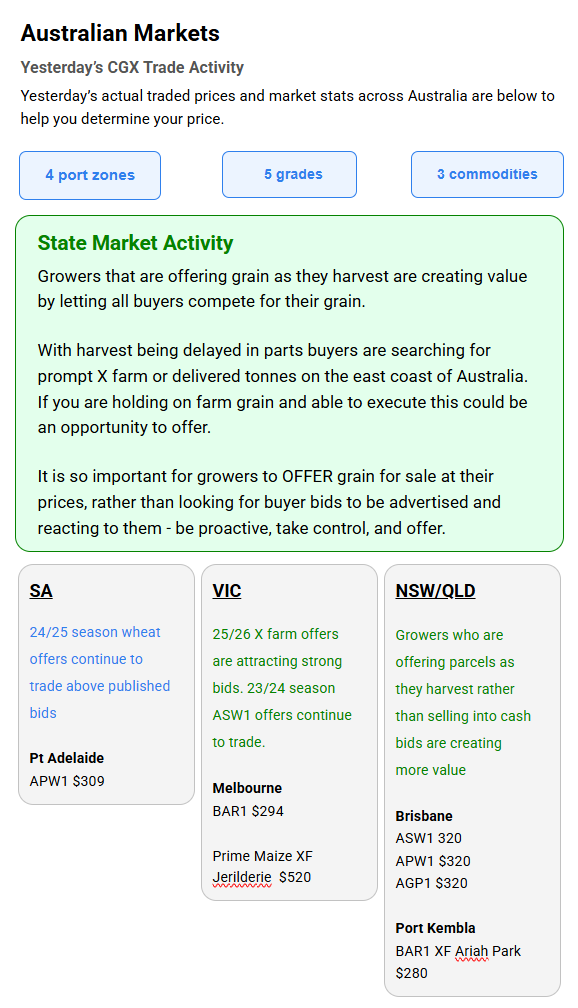 Australia’s independent grain report—designed to help support your pricing decisions before the market opens at 10:00am AEST. If you need to change your offer price, simply edit it before market open.