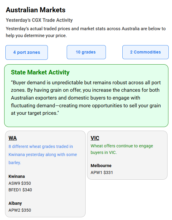 Australia’s independent grain report—designed to help support your pricing decisions before the market opens at 10:00am AEST. If you need to change your offer price, simply edit it before market open.