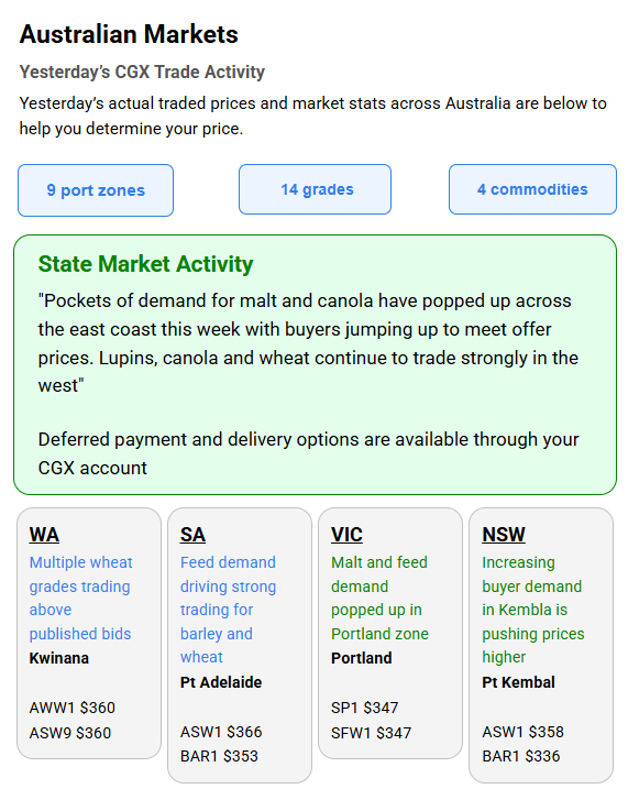 Australia’s independent grain report—designed to help support your pricing decisions before the market opens at 10:00am AEST. If you need to change your offer price, simply edit it before market open.