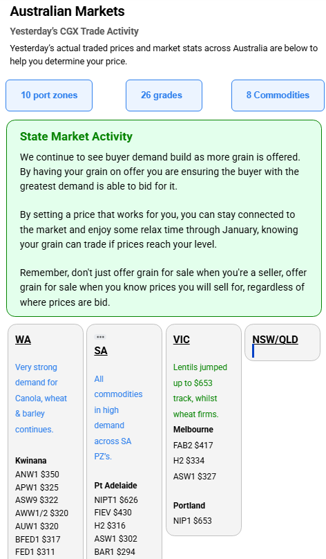 Australia’s independent grain report—designed to help support your pricing decisions before the market opens at 10:00am AEST. If you need to change your offer price, simply edit it before market open.