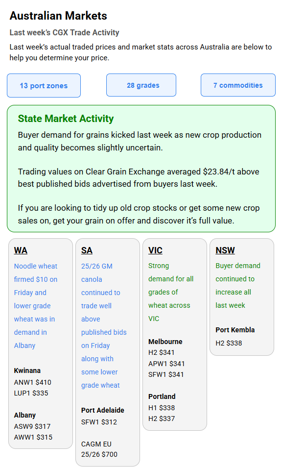 Australia’s independent grain report—designed to help support your pricing decisions before the market opens at 10:00am AEST. If you need to change your offer price, simply edit it before market open.