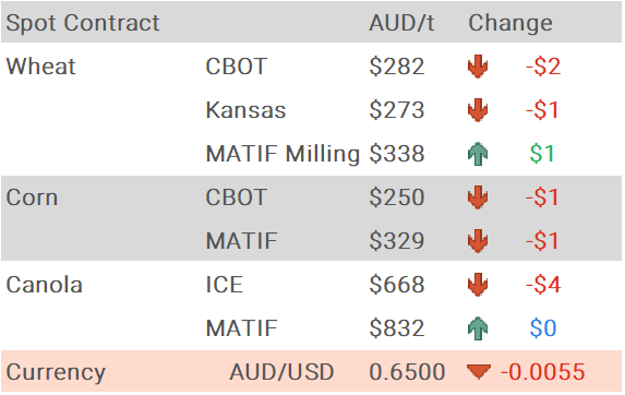 Local markets where an export surplus is guaranteed will be on the backfoot today with the softening in global grain values on Friday night. With global wheat crop estimates continuing to rise, values remain under pressure leading into our harvest. In the south, production uncertainty will limit selling and keep grain values firm.