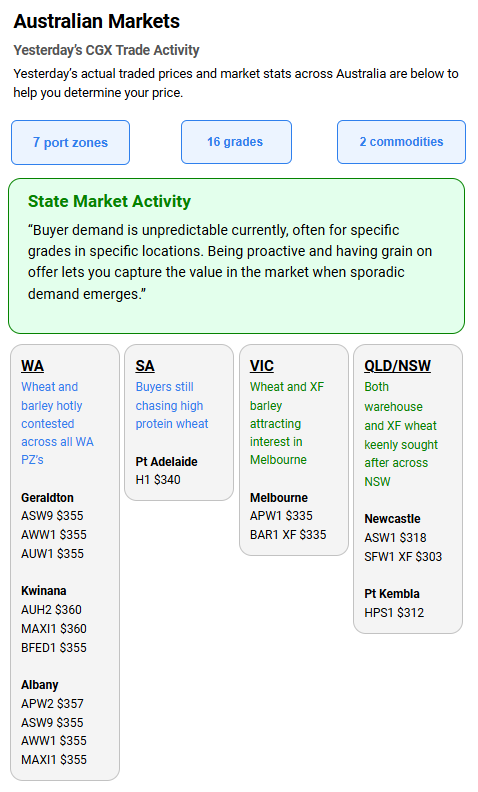 Australia’s independent grain report—designed to help support your pricing decisions before the market opens at 10:00am AEST. If you need to change your offer price, simply edit it before market open.
