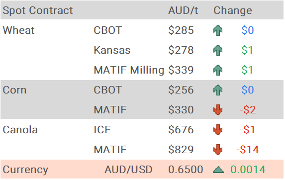 Nothing much has changed from a global fundamental picture so local cash markets will look to any changes in local sentiment or S&D. The larger WA crop will compensate for losses across the south-east but the southern port zone S&D has tightened which has led to some old crop premiums as end user seek to take cover on ASW (lowest old crop quality available) in delivered markets $375/t Melb/Geel up $20/t the past fortnight. Southern markets will remain on the defensive until the trade can assess the impact of forecast showers with 15-25mm expected to hit crops in need over the next week….it is too late for early southern areas making it tricky to assess.