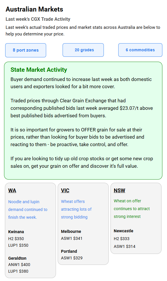 Australia’s independent grain report—designed to help support your pricing decisions before the market opens at 10:00am AEST. If you need to change your offer price, simply edit it before market open.