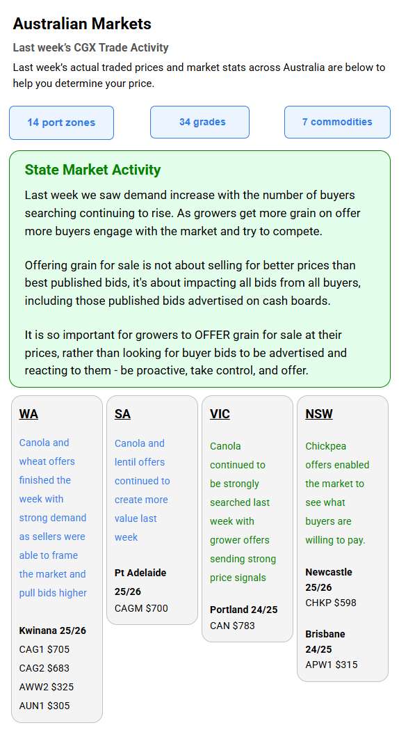 Australia’s independent grain report—designed to help support your pricing decisions before the market opens at 10:00am AEST. If you need to change your offer price, simply edit it before market open.