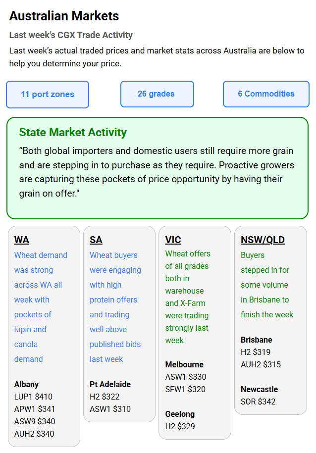 Australia’s independent grain report—designed to help support your pricing decisions before the market opens at 10:00am AEST. If you need to change your offer price, simply edit it before market open.