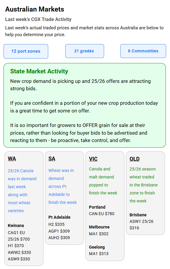 Australia’s independent grain report—designed to help support your pricing decisions before the market opens at 10:00am AEST. If you need to change your offer price, simply edit it before market open.