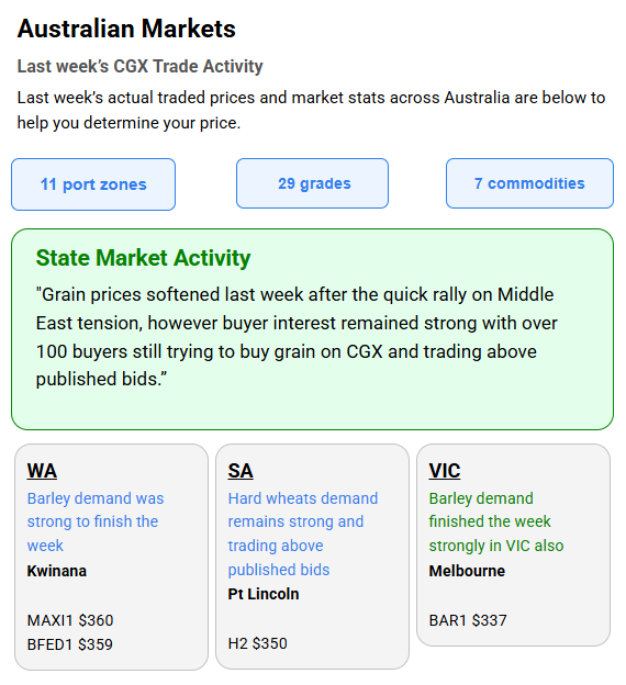 Australia’s independent grain report—designed to help support your pricing decisions before the market opens at 10:00am AEST. If you need to change your offer price, simply edit it before market open.