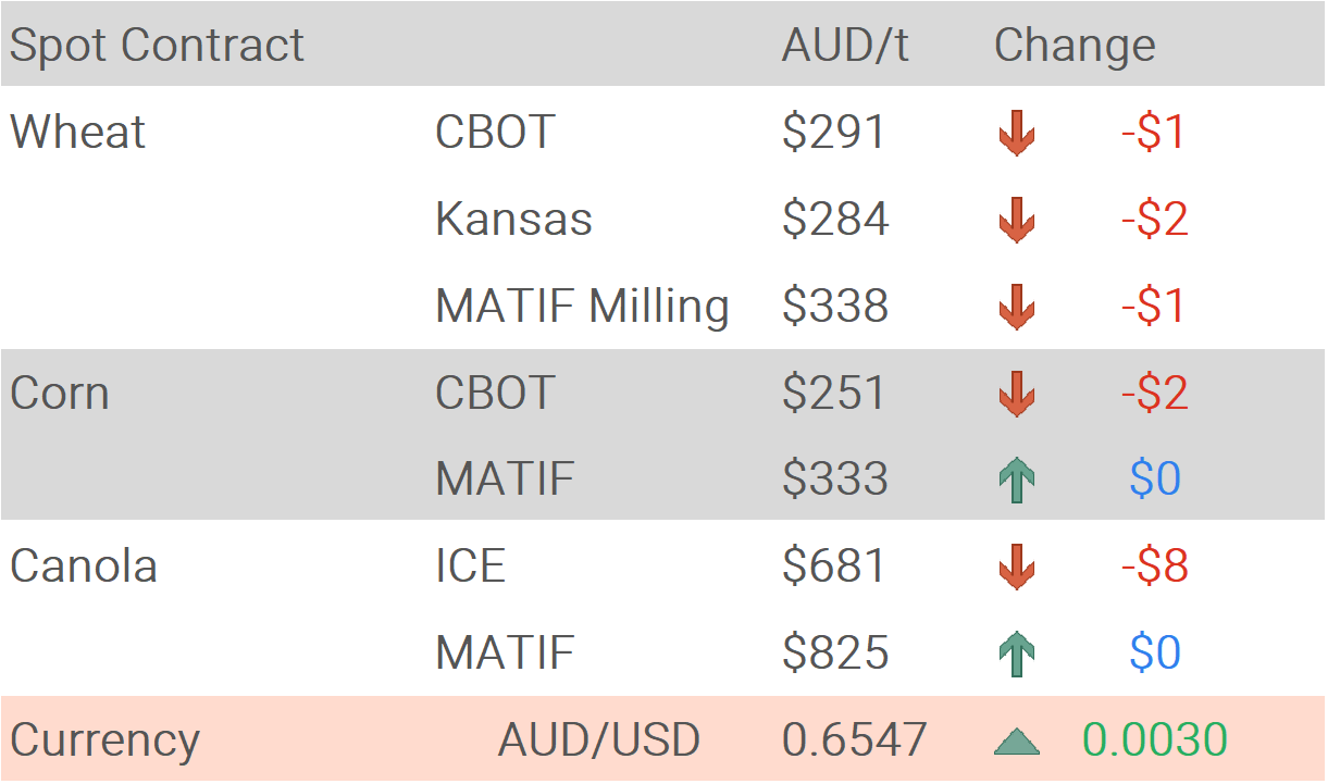 No change in global grain markets over the weekend. Wheat continues to be weighed down by ample supplies and a competitive export market. US wheat export sales have fallen (317,000t vs estimates of 350-700,000t) as larger Black Sea supplies hit the market.
