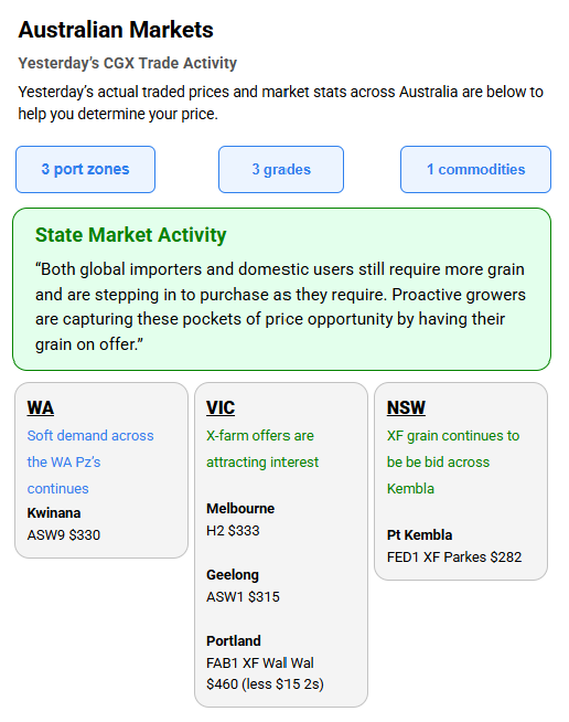 Australia’s independent grain report—designed to help support your pricing decisions before the market opens at 10:00am AEST. If you need to change your offer price, simply edit it before market open.