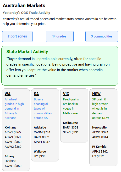 Australia’s independent grain report—designed to help support your pricing decisions before the market opens at 10:00am AEST. If you need to change your offer price, simply edit it before market open.