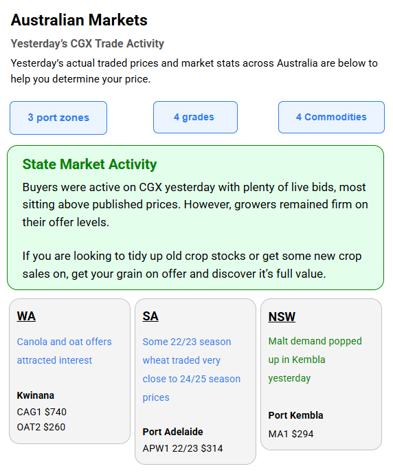 Australia’s independent grain report—designed to help support your pricing decisions before the market opens at 10:00am AEST. If you need to change your offer price, simply edit it before market open.