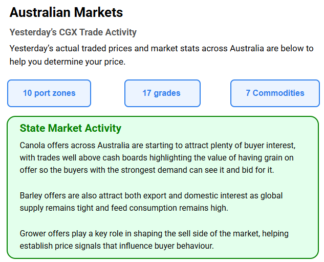 Australia’s independent grain report—designed to help support your pricing decisions before the market opens at 10:00am AEST. If you need to change your offer price, simply edit it before market open.