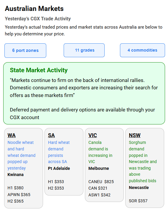 Australia’s independent grain report—designed to help support your pricing decisions before the market opens at 10:00am AEST. If you need to change your offer price, simply edit it before market open.
