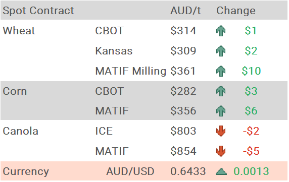 Wheat extended gains last night supported by a weaker $US and short-covering encouraged by production concerns. Production concerns across northern Europe, China and Australia has the market on the defensive with import interest expected to have been stoked by the recent falls in prices and the weakening $US.