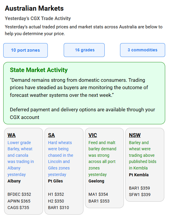 Australia’s independent grain report—designed to help support your pricing decisions before the market opens at 10:00am AEST. If you need to change your offer price, simply edit it before market open.
