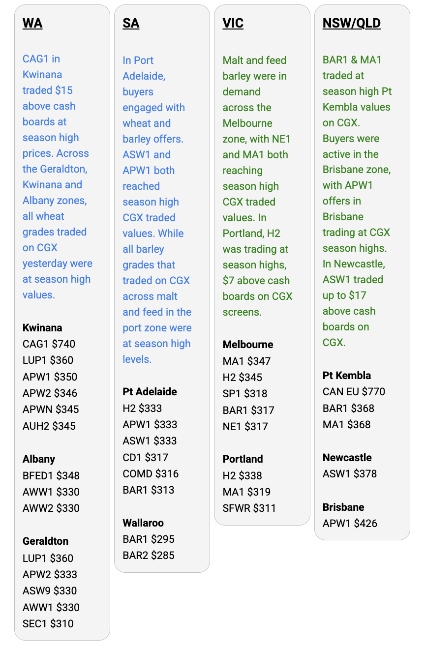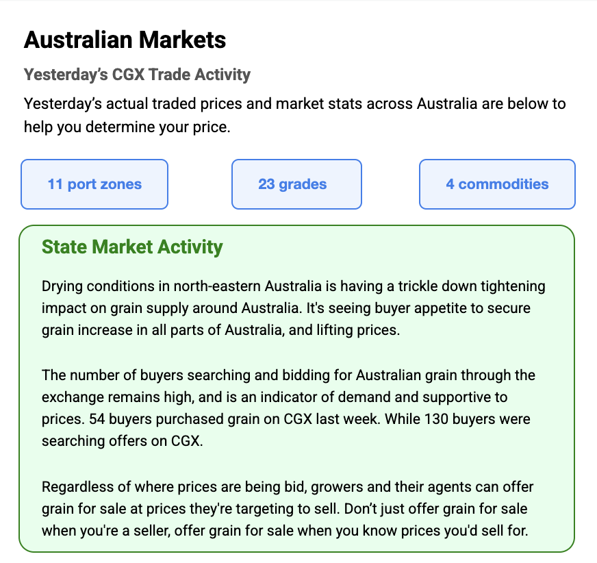 Australia’s independent grain report—designed to help support your pricing decisions before the market opens at 10:00am AEST. If you need to change your offer price, simply edit it before market open.