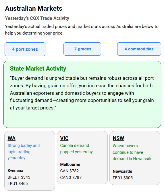 Australia’s independent grain report—designed to help support your pricing decisions before the market opens at 10:00am AEST. If you need to change your offer price, simply edit it before market open.