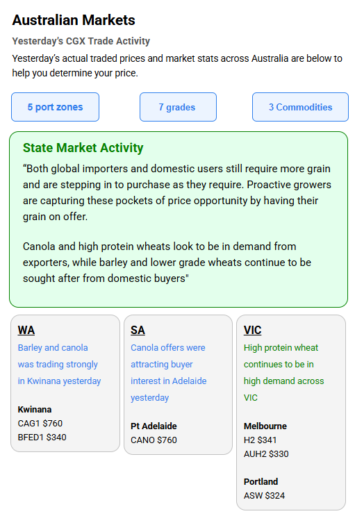 Australia’s independent grain report—designed to help support your pricing decisions before the market opens at 10:00am AEST. If you need to change your offer price, simply edit it before market open.