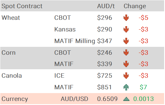 Nothing market moving overnight. Global wheat markets are anticipating some pricing pressure when Russia decides to step up its export program with near term sentiment likely to be driven by US export sales. We are sensing there has been a step up in competition with Black Sea prices now starting to move lower to attract export interest.