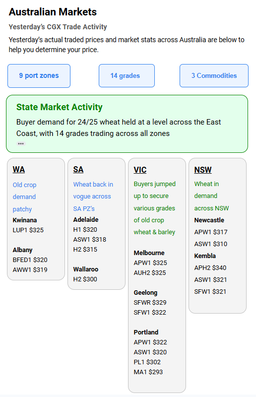 Australia’s independent grain report—designed to help support your pricing decisions before the market opens at 10:00am AEST. If you need to change your offer price, simply edit it before market open.